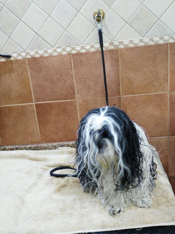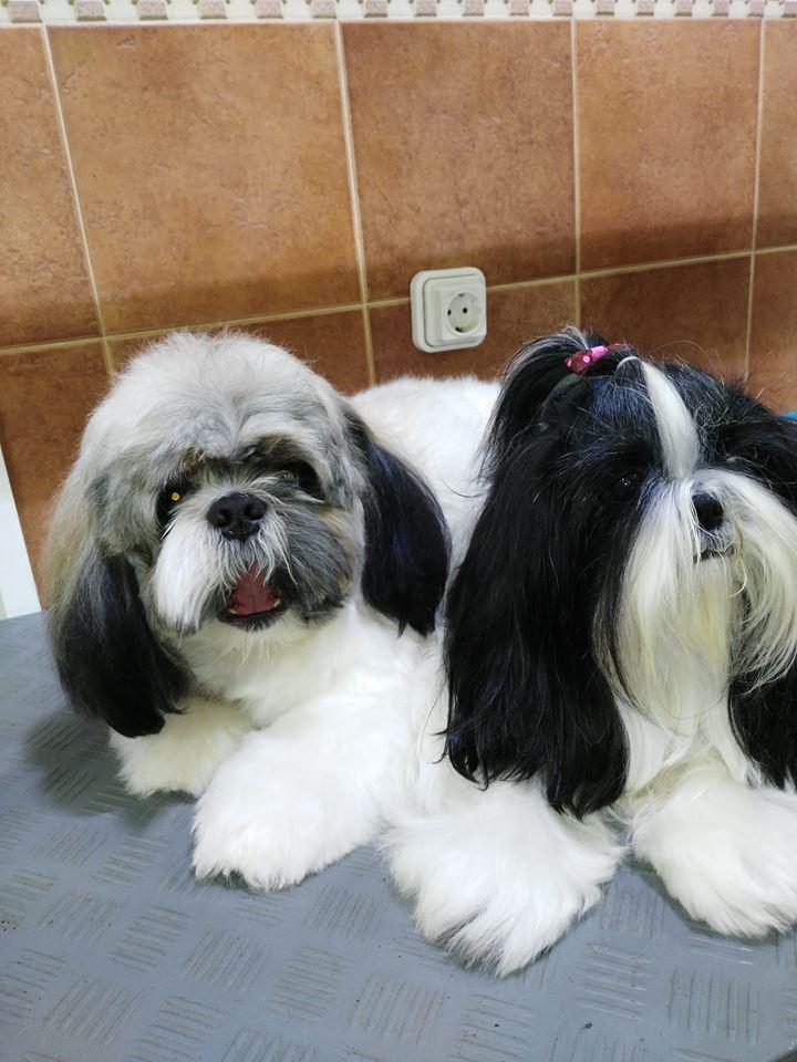 - Baño y retoque, el cual se inicia con un cepillado con la finalidad de eliminar la suciedad adherida al pelaje y desenredar los posibles nudos. Luego, se procede a cortar a máquina el pelo de la zona anal y abdominal, para dar al animal dos baños con un champú adaptado a él. También se lleva a cabo una limpieza auricular y ocular, y se coloca crema acondicionadora en función del tipo de pelaje. Después, se seca el manto y se vuelve a cepillar. Por último, se retoca todo el pelaje a tijera y se revisa la longitud de las uñas.