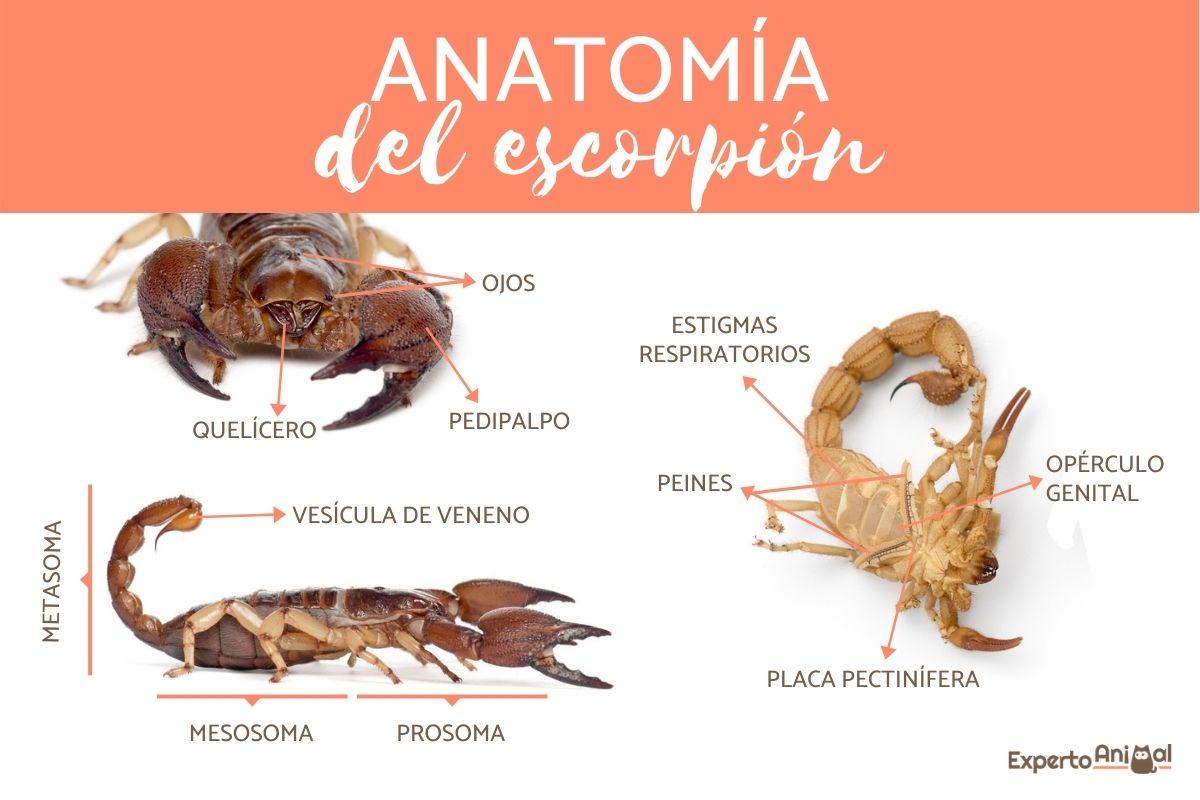 Centrándonos ahora en las características de los escorpiones referentes a su anatomía y morfología, podemos decir que los escorpiones tienen un cuerpo dividido en dos regiones: el prosoma o región anterior y el opistosoma o región posterior, formadas por un conjunto de segmentos o metámeros. En este último también se pueden distinguir dos partes: el mesosoma y el metasoma. No obstante, en su conjunto, la longitud corporal de los escorpiones puede variar desde unos pocos milímetros hasta más de 10 centímetros, según la especie.
