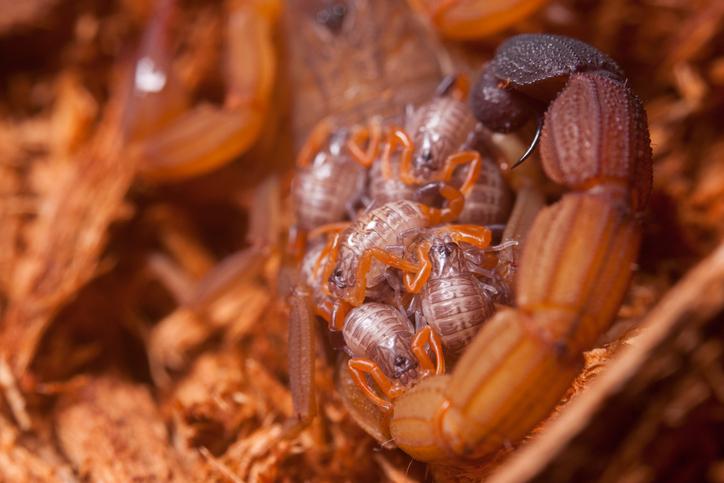 - Son ovovivíparos o vivíparos y el número de crías oscila entre 1 y 100. Tras la salida de estas, los escorpiones adultos les dan cuidados parentales.