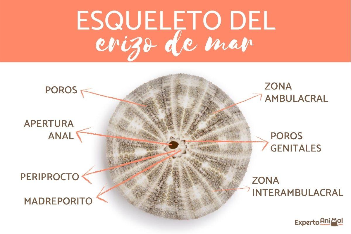 El esqueleto de los erizos de mar presenta simetría pentarradial, es decir, está dividido en 5 partes iguales, cada una de ellas formada por 2 hileras de placas. Estas 5 partes se conocen como zonas ambulacrales y son homólogas a los brazos de las estrellas de mar. Las placas que la forman presentan una serie de poros por los que salen los pies ambulacrales. Estos son unas estructuras que conectan con su sistema acuífero y les sirven para respirar, capturar organismos diminutos o expulsar toxinas paralizantes.