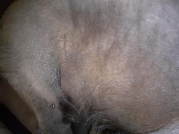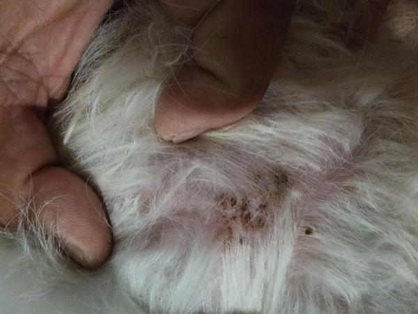 Mi perro es de raza maltes. Tiene picor en la parte baja del lomo, rabo en la parte superior y patas. He notado una parte roja y en algunos lados tien como una cascarilla de color negra