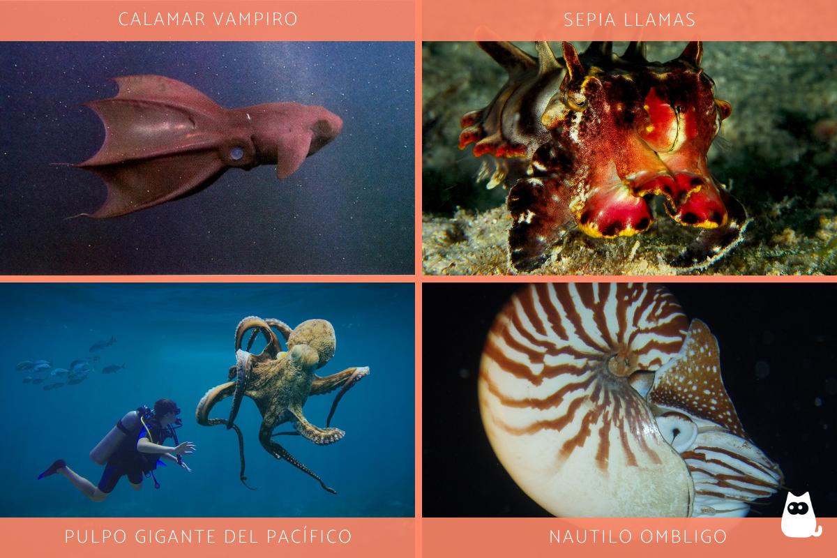 Hemos mencionado que los cefalópodos se conocen comúnmente como calamares, sepias, pulpos y nautilos. No obstante, a continuación nombraremos algunos ejemplos de especies concretas para conocer mucho mejor a los tipos de cefalópodos: