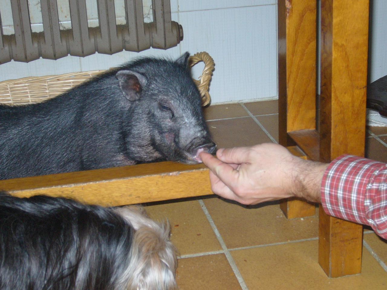Las raciones de comida diaria estarán repartidas en dos tomas, algo importante para que realicen una buena digestión. Siempre debe tener abundante agua fresca disponible. Si tienes a tu cerdo en el campo pastando deberás reducir sus dosis diarias de comida. Tampoco le ofrezcas comida para humanos pues el resultado será un cerdo con demasiada grasa, enfermizo y poco saludable. Un falso mito es que puedes conseguir un cerdo más pequeño si le alimentas menos. Eso es totalmente absurdo y falso, y se considera maltrato en toda regla.