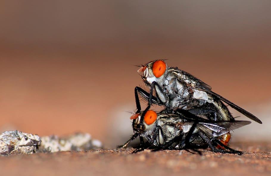 Como en todos los insectos, la reproducción de las moscas ocurre únicamente en su estado adulto. Antes de que esto suceda, el macho debe cortejar a la hembra. Para ello, el macho “canta” gracias a la vibración de sus balancines o halterios, unas estructuras que emplean, también, para controlar la postura durante el vuelo. A ello se debe el característico sonido de las moscas.