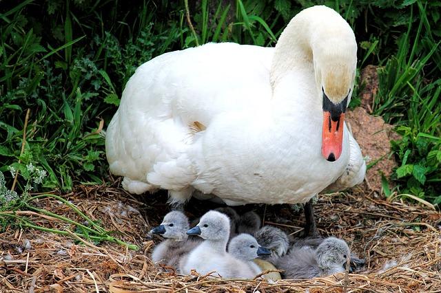 - Cisne mudo: los polluelos salen del nido al día siguiente de nacidos y el macho suele llevar al agua al primero en eclosionar. Es común que los pequeños monten sobre sus madres. A los 60 días ya inician su vuelo y en la siguiente temporada reproductiva son ahuyentados del grupo por sus propios padres para unirse a otros ejemplares no reproductivos durante unos dos años.