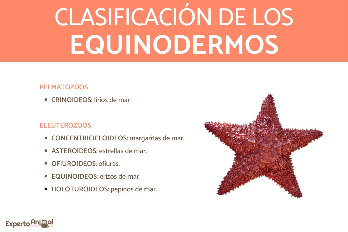 Este filo está dividido en dos subfilos: Pelmatozoos (con forma de copa o cáliz) y eleuterozoos (cuerpo estrellado, discoidal, globular o con forma de pepino).