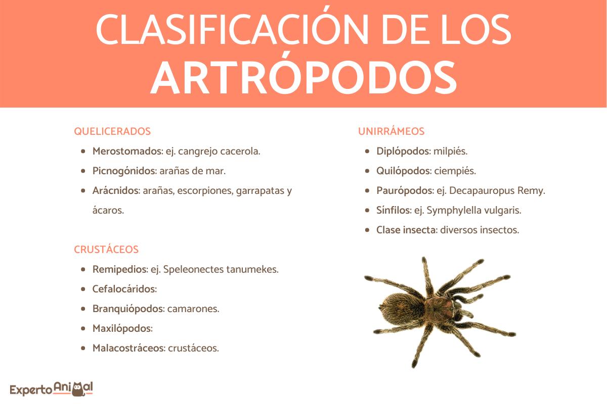 - Arácnidos: cuentan con dos regiones o tagmas, quelíceros, pedipalpos no siempre bien desarrollados y cuatro pares de patas. Se incluyen a las arañas, los escorpiones, las garrapatas y los ácaros.