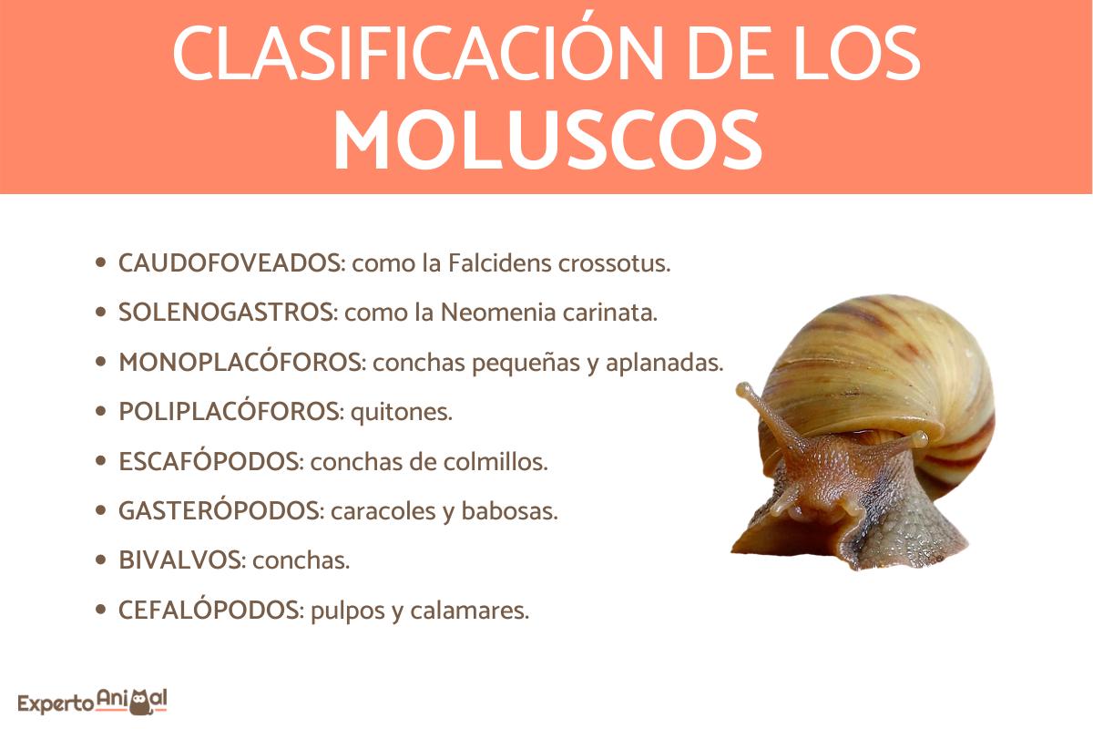 - Gasterópodos: con formas asimétricas y presencia de concha, la cual ha sufrido efectos de la torsión, pero que puede estar ausente en algunas especies. La clase está integrada por caracoles y babosas, como la especie de caracol Cepaea nemoralis.