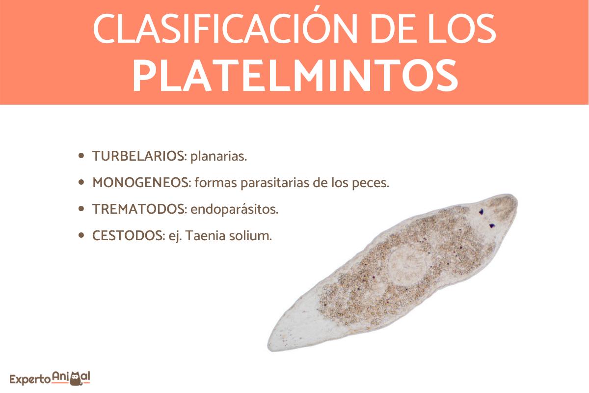 - Cestodos: con características que difieren de las clases anteriores, poseen cuerpos largos y planos, carentes de cilios en la forma adulta y de tubo digestivo. Sin embargo, está cubierto de micro vellosidades que engrosan el tegumento o cobertura del animal (ej. Taenia solium).