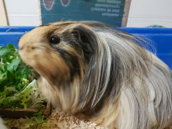 Esta cobaya tiene el dulce aspecto de un peluche. Su pelo es corto pero mucho más esponjoso que las dos anteriores. Tiene unos bonitos bigotes que resaltan su rostro. Esta cobaya no necesitará cuidados excesivos pero cepilarla de forma ocasional le ayudará a no acumular pelo y a estar más limpia.