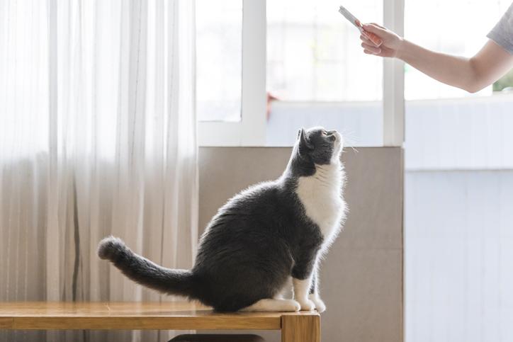 - Tu gato se sentará y/o inclinará su cuerpo hacia atrás. Haz “click” con el clicker y dale rápidamente el premio.