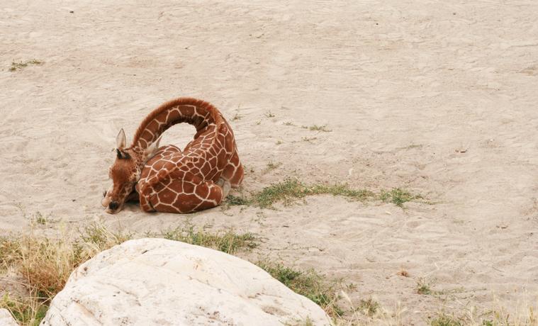 A pesar de esto, las jirafas pueden tumbarse sobre el suelo cuando están muy cansadas. Al hacerlo, apoyan la cabeza sobre su lomo para estar más cómodas.
