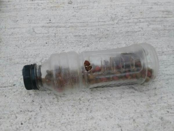 hola Isadiaz, disculpa la demora pero decidi esperar a regresar a la casa para tomarle una foto a la botella para que se mas facil de explicar, esta es una botella de un gaterade que el plastico es mas grueso que las demas y le hice un par de agujeros pequeños para que a la hora que mueva la botella salgan pocas croquetas, nose si se pueda subir un video si se puede lo subo de como la usa mi pirata Jacky