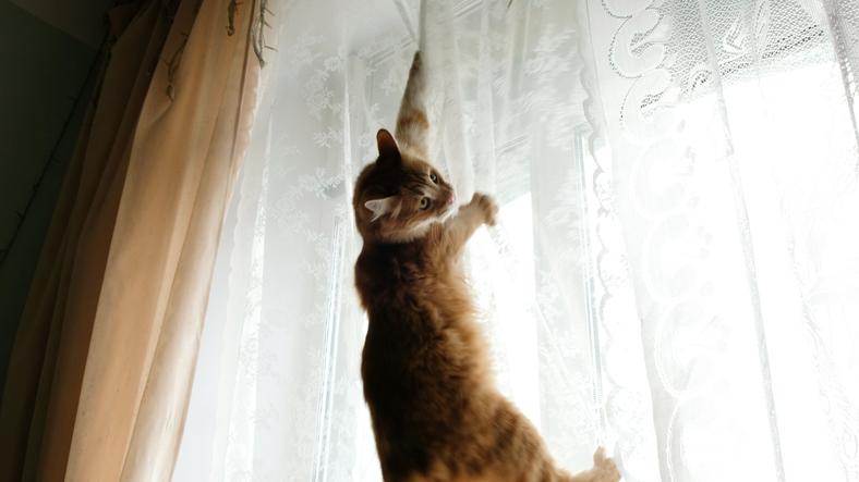 Algunos gatos trepan por las cortinas y otros se esconden detrás de ellas, pero, ¿por qué les gustan tanto? Para ellos son fascinantes porque se mueven sigilosamente y a veces hasta tienen una cuerda intrigante colgando. Todos estos factores son una invitación a jugar para estos animales. Para evitar que trepen por las cortinas es necesario hacerlas poco interesantes para los gatos. Así, ponlas de tal modo que no lleguen hasta el suelo o la repisa de la ventana para que el dobladillo termine al menos 10 centímetros por encima de él. También puedes atarlas, especialmente si tu gato está solo en casa, y evitar que se mueva.