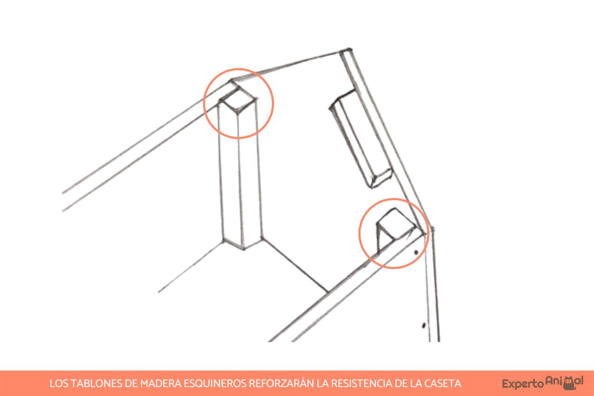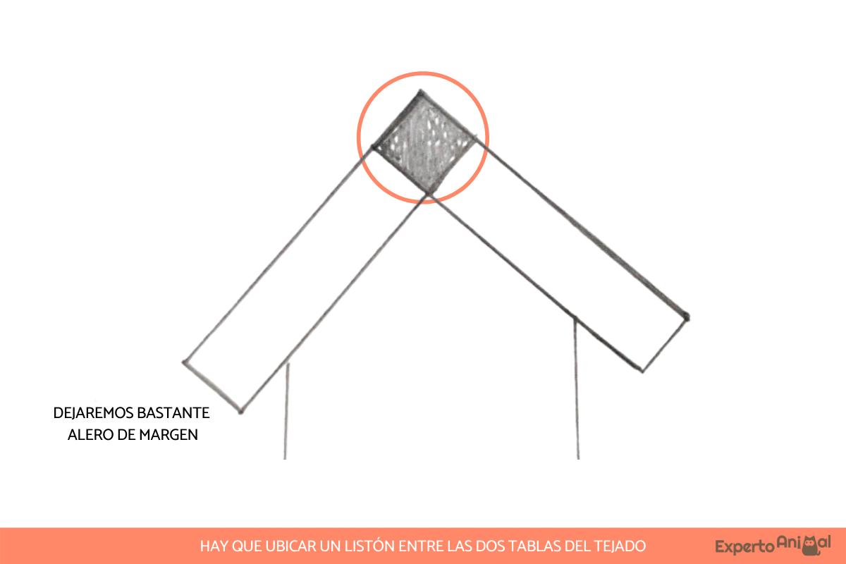 - Consejo extra: cuando coloques el techo, ten el cuidado de que las tablas queden en un ángulo de 90 grados. Así evitarás que se cree un canalillo por donde se pueda filtrar el agua. Otra solución sería colocar un listón entre las dos tablas del techo. También, asegúrate de dejar un buen alero.