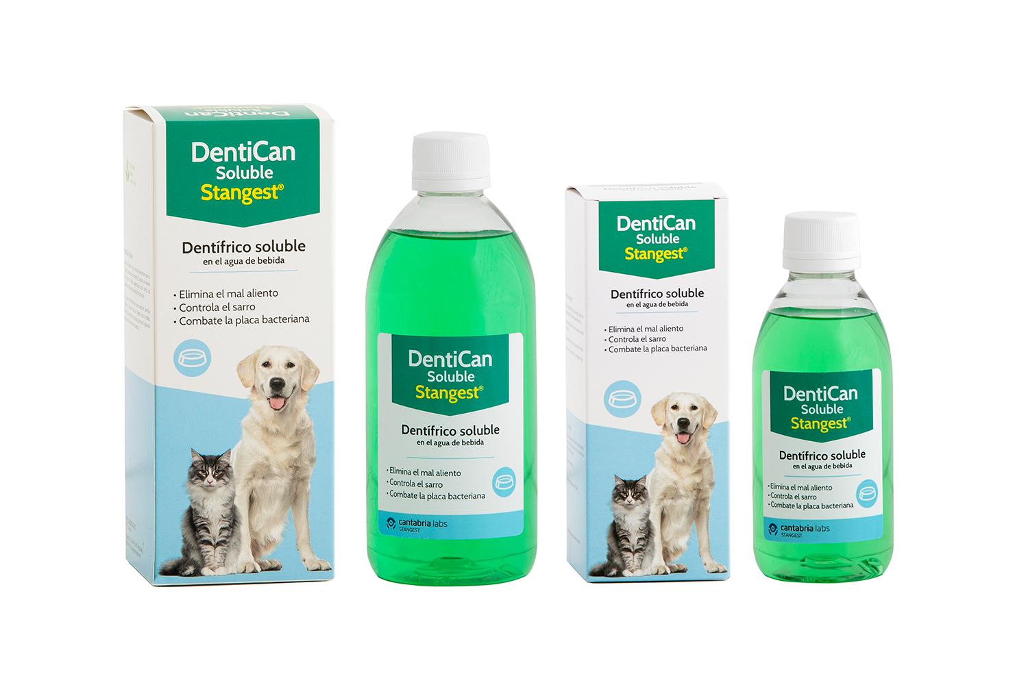 Este tipo de productos suele ser antiséptico y además de combatir el sarro y la placa ayuda también a eliminar el mal aliento del perro. Dentican Soluble de Stangest es un excelente ejemplo de este tipo de producto. Se trata de un dentífrico que se disuelve en el agua que el can tomará, de manera que actúa contra la placa bacteriana de una forma cómoda y sin que el animal lo note. Tan solo se debe diluir un tapón de producto en un litro de agua. Se puede usar en canes de 6 meses o más.