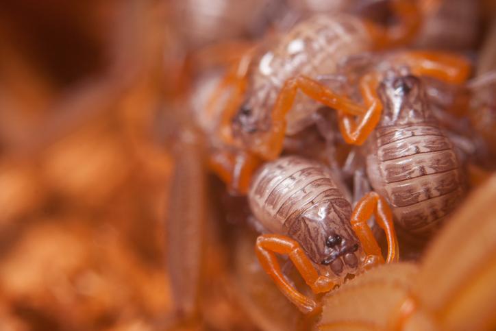 Las crías de alacrán dependen de su madre para completar su crecimiento o desarrollo, debido a que no son capaces de alimentarse por su cuenta, por lo que deben hacerlo succionando del cuerpo de su progenitora. Además, deben desarrollar su primer tejido externo o exoesqueleto antes de bajarse de ella y poder ser independientes, ya que al momento de nacer su tejido es todavía blando, lo que les hace ser mucho más sensibles.