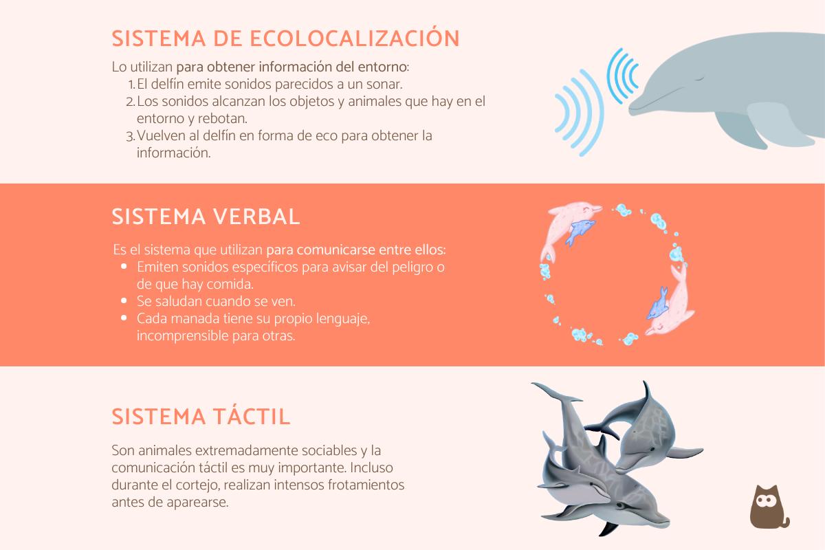Los chasquidos ultrasónicos que emiten, generalmente, son inaudibles para el ser humano, chocan con los objetos de alrededor y devuelven un eco perceptible por los delfines incluso en entornos realmente ruidosos. Aunque no la usan para relacionarse realmente entre ellos, los delfines se comunican a través de ondas sonoras con el entorno, es decir, gracias a esto pueden guiarse por el mar y evitar ser la comida de cualquier depredador, siendo entonces esta una de las maneras de conocer y relacionarse con los elementos del hábitat.