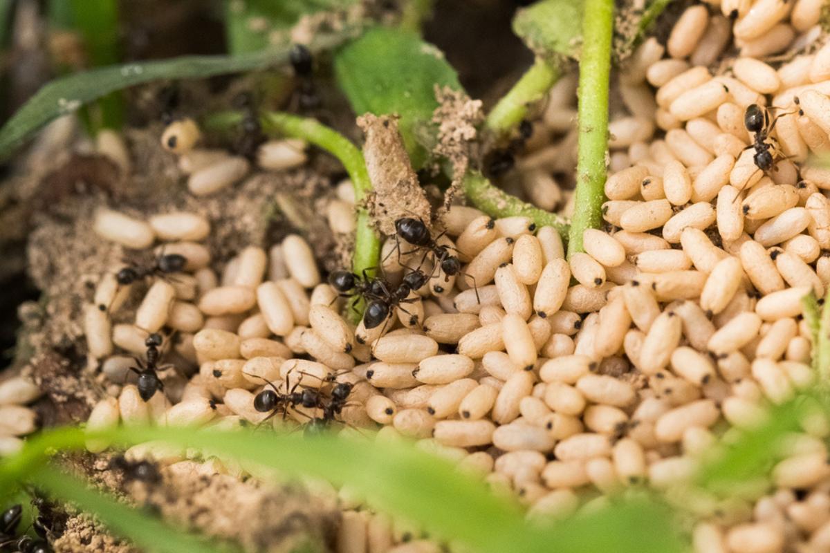 Seguro que te estás preguntando si las hormigas ponen huevos. Lo cierto es que la reina es capaz de poner huevos fértiles no fecundados durante toda su vida, que darán lugar a las obreras y soldados. Que nazca un tipo u otro depende de las hormonas y del alimento ingerido durante las primeras fases de su vida. Estas hormigas son seres haploides (tiene la mitad del número normal de cromosomas de la especie). Una hormiga reina puede poner entre uno y varios miles de huevos en pocos días.