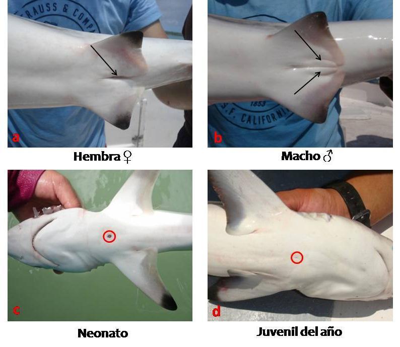 En la imagen inferior podemos observar a) Órgano sexual femenino (o cloaca) del tiburón; b) Órgano sexual masculino (o claspers); c) Tiburón en estadio neonatal con el orificio umbilical abierto; d) Tiburón juvenil del año con el orificio umbilical parcialmente cerrado.