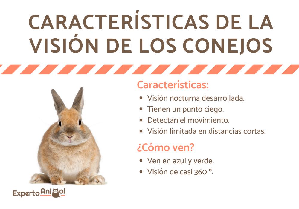 Si bien no existen muchas investigaciones al respecto, se conoce que la vista de los conejos no es el sentido más desarrollado de los conejos, pero poseen una visión binocular de casi 360 grados, con un punto ciego al tener los ojos en posición lateral y no frontal como otros animales. A distancias cortas, su visión es limitada, pero pueden detectar movimientos a larga distancia. Asimismo, su sensibilidad visual es alta, es decir, su capacidad de ver con poca luz, ya que en la oscuridad pueden ver 10 veces más que un humano, y es por esto que tienen hábitos crepusculares y nocturnos en la naturaleza.
