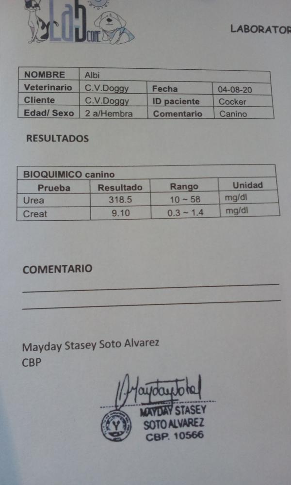 Buen dia. Tuve una cachorra cocker a los dos años y 3 meses de vida falleció. El 8 de julio recibió sus vacunas de año y su desparacitacion, dos dias despues presentó vomitos solo por las mañanas en la veterinaria nos recetaron pastillitas gastropet y otra para los vomitos. A la semana siguiente nuevamente con los vomitos y seguido de popo suelta y oscura. Se le practico luego un Exámen de sangre y dos dias mas tarde una ecografía. Resultados de sangre urea 250 y creatina.7.8 valores muy altos. Ecografia resultaro riñones alterados un riñon mas pequeño que el otro. La veterinaria dos dias previos al analicis de mi perrita no le aplico suero pese a que se le indico que no había comido desde el dia anterior y posterior al analisis de sangre solo le aplico dos hrs de suero los dos primeros dias y cuando se ven síntomas que empeora le receta suero todo el dia x los 4 dias siguientes mi perrita el dia 5 del tratamiento se le motaba mas decaida y con un babeo exagerado(. Todas las noches la pasaba muy mal no dormia. tenía nauses,vómitos tembladeras la popo cambio color pastoso amarillento). La densidad de su sangre era rala y su venas muy débiles llevaba 6 dias sin comer. Nos recomendaron cortarle el agua por las náuseas. En el segundo examen subieron los niveles Urea a 300 y creatina a 9. Me he quedado con mil incógnitas que provocó este mal..fueron las vacunas? La desparacitacion? O fue una enfermedad que avanzó lentamente? Y por otro lado siento que su doctora no manejo el tratamiento adecuadamente desde el inicio y mi hija perruna sufrio mucho . Con esos resultados del.examen de sangre y ecografia habia alguna posibilidad de que sobreviva mi pequeña?