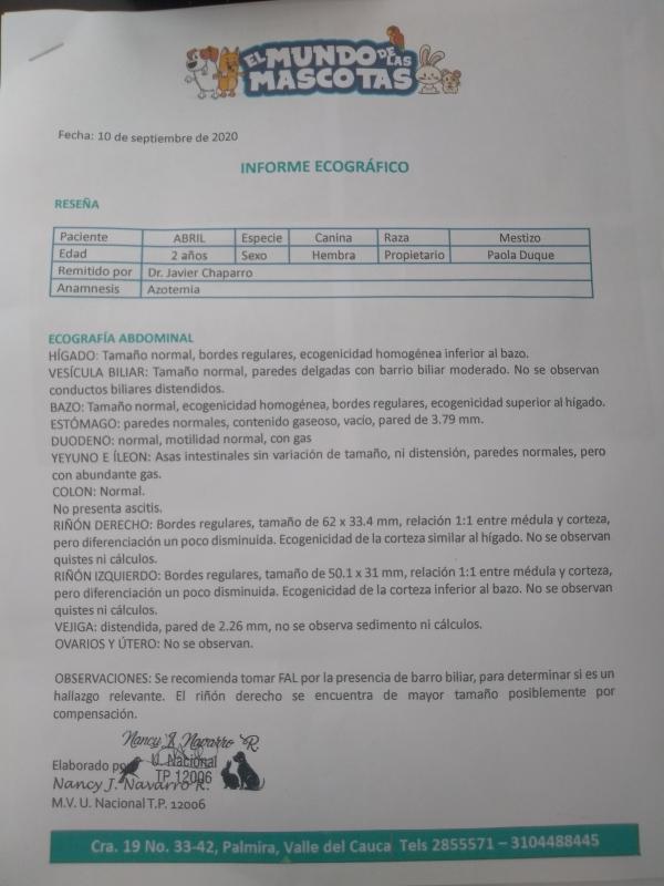 Hola buenos días. Le hicieron la ecografía vieron que riñón derecho está más grande, le he cambiado la dieta. Le estoy dando canatox 80 gotas diarias por sus 26 kg y renal balance. Una pera ,manzana o mango diario. Adjunto resultados ecografía.
