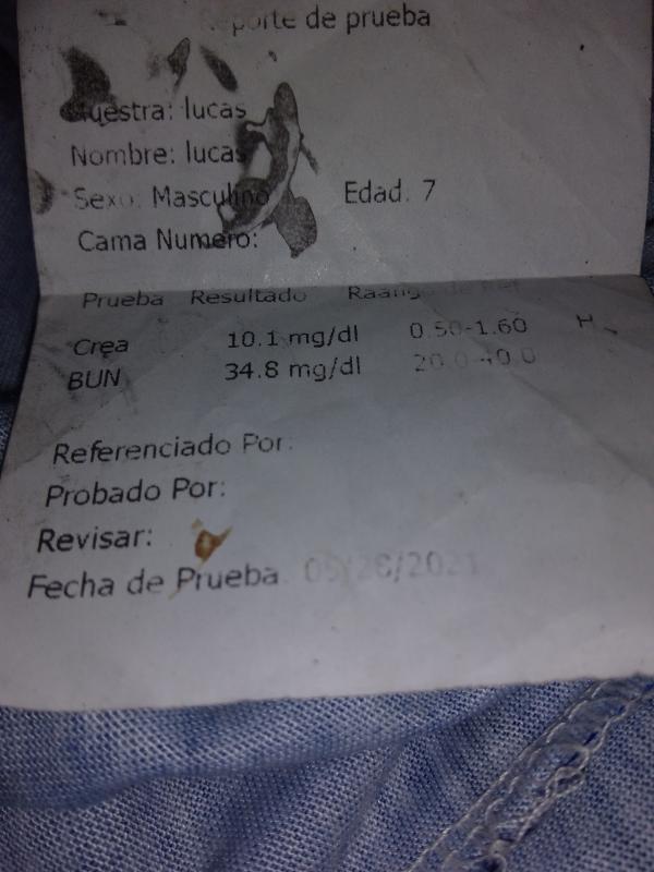 Hola, buenas noches quería consultar el caso de mi Lucas el tenía ya 7 años y medio el estuvo bien pero si tomaba bastante agua y los orines eran transparentes, yo pensé que era normal por la cantidad de agua que bebía, de pronto para amanecer un martes el tenía fiebre y eso de 7 de mañana empieza a convulsionar lo lleve al veterinario le sacaron placas dijo que tenía obstrucción intestinal y que supuestamente había un cuerpo extraño, le dio un laxante todo ese día hasta el día siguiente mi hijo convulsionó unas 7 veces, de ahí el estaba con suero, el Dr. Le ponía vitaminas antibiótico y para el dolor sin embargo no mejoraba ya para amanecer viernes mi hijo vomitó con un pequeño cuagulo de sangre y como todos los días lo llevaba al veterinario para que le inyecte y le ponga la vía para el suero, y descidieron operar para sacar el cuerpo extraño, pero mi hijo estaba muy débil es más sacamos prueba de distemper y salió negativo, lo lleve a otro veterinario el tiene mejor implementado su veterinaria así que lo lleve y el Dr. Me dijo que necesitaba sacarle un perfil hepático y dijo que mi hijo estaba desaseado que ya no se podía hacer nada que tenía insuficiencia renal aguda y que su creatinina estaba muy elevada y que mejor era hacerlo descansar que solo iba a empeorar