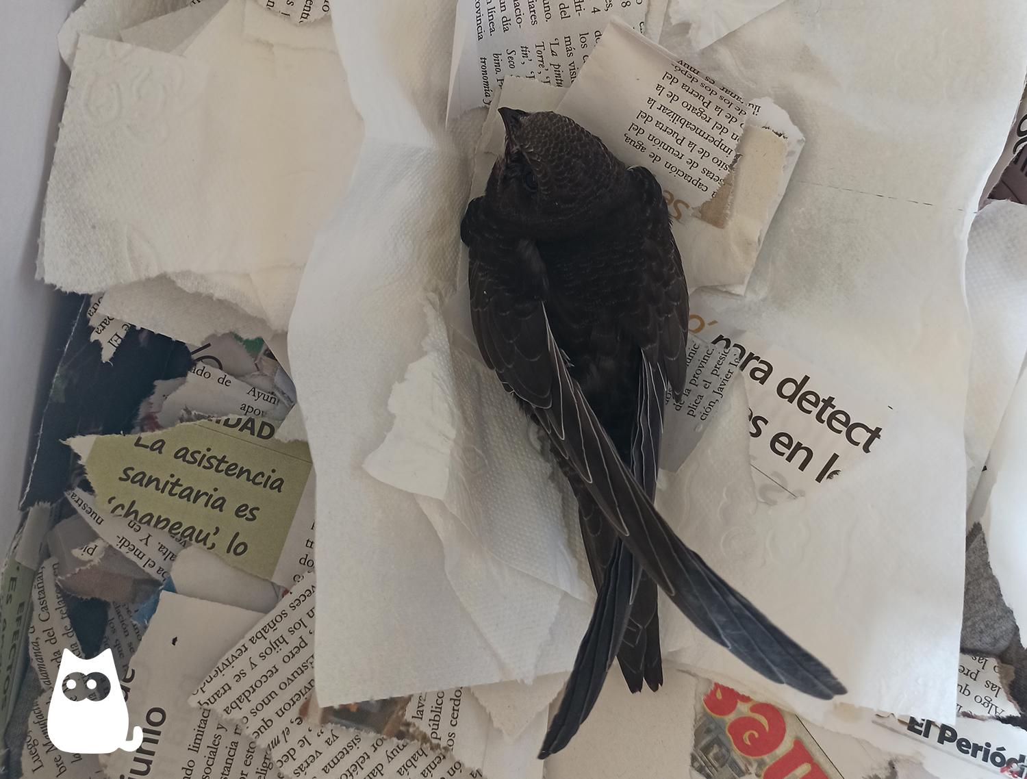 Una cría de vencejo no debe meterse dentro de una jaula, ya que puede hacerse daño en las plumas. Durante todo el tiempo que dure la crianza, el polluelo tiene que permanecer siempre dentro de una caja de tamaño mediano, como una caja de zapatos. Debemos realizarle agujeros para que el ave pueda respirar y llenar el fondo con papel absorbente. Este papel tiene que mantenerse siempre limpio y cambiarse cada vez que el vencejo defeque.