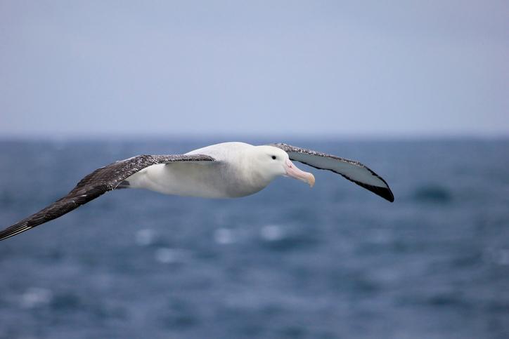 El pájaro volador más grande del mundo es el albatros viajero (Diomedea exulans), pues con las alas extendidas mide 3,5 metros de un ala a otra y tiene 1,5 metros de altura. El albatros es un animal de vida marina que se puede encontrar tanto en temperaturas australes y tropicales como antárticas. Este pájaro se encuentra en peligro de extinción.