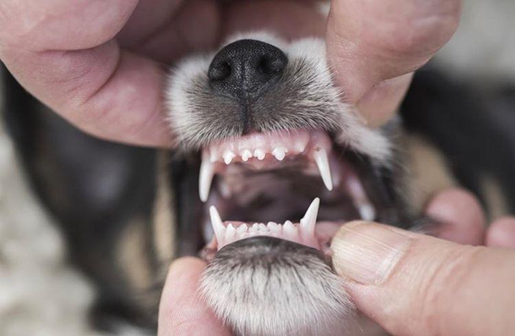 Los perros cachorros, al igual que los bebés, no poseen dientes al nacer. De forma eventual algunas crías recién nacidas presentan una o dos piezas de leche semidesarrolladas. Durante la lactancia, los pequeños deben alimentarse exclusivamente de la leche materna que succionan de las mamas de su progenitora.