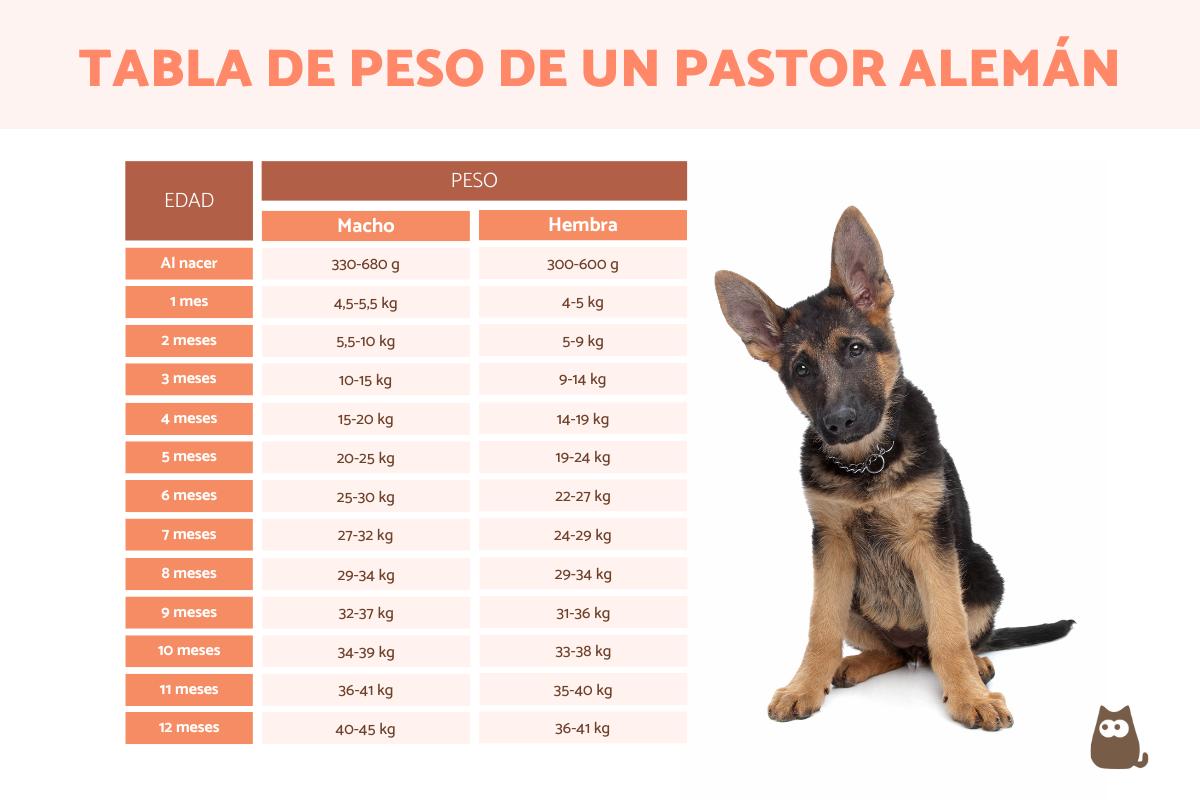 Los pesos mostrados son orientativos, ya que el nivel de actividad del cachorro y su alimentación pueden influir en su crecimiento. Recomendamos acudir al centro veterinario en caso de observar que el cachorro no gana peso o, por el contrario, está engordando mucho más de lo que debería para someterlo a una exploración y determinar si su salud se está viendo comprometida. Dicho esto, aquí tienes la tabla de peso para comprobar el crecimiento de un pastor alemán y saber el peso de un pastor alemán de 3 meses, 4 y hasta los 12: