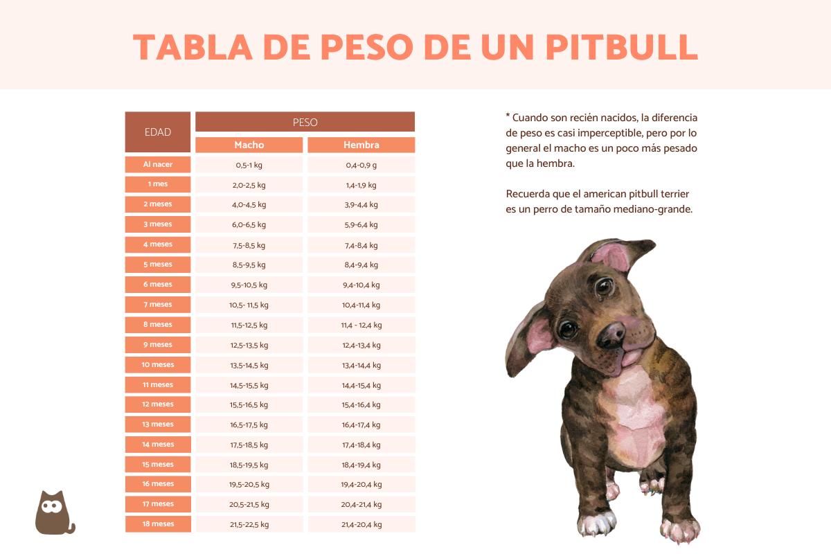 De todas formas, en la siguiente tabla de crecimiento del pitbull te ofrecemos un promedio del peso de un pitbull de 2, 3 y hasta 18 meses de tamaño. Ten en cuenta que peso real puede variar considerablemente debido a la genética, la nutrición, la salud general y el nivel de actividad del perro.