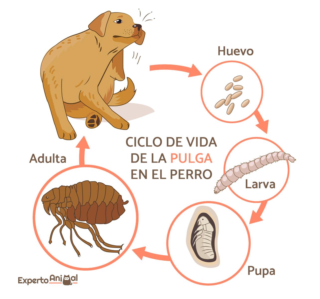 Las pulgas adultas viven sobre nuestros animales, alimentándose de su sangre mediante picadura. Sobre ellos las hembras ponen huevos, un máximo de 50 al día, que van a caer al ambiente, donde se desarrollarán. Con estas cifras es importante saber cuánto tiempo vive una pulga: pueden llegar a vivir hasta 160 días pero, como los animales que las padecen suelen interceptarlas, la media se reduce a 1-3 semanas. Esto implica que la pulga que descubrimos en nuestro animal puede haber puesto 350-1050 huevos que estarán en nuestra casa convirtiéndose en pulgas.