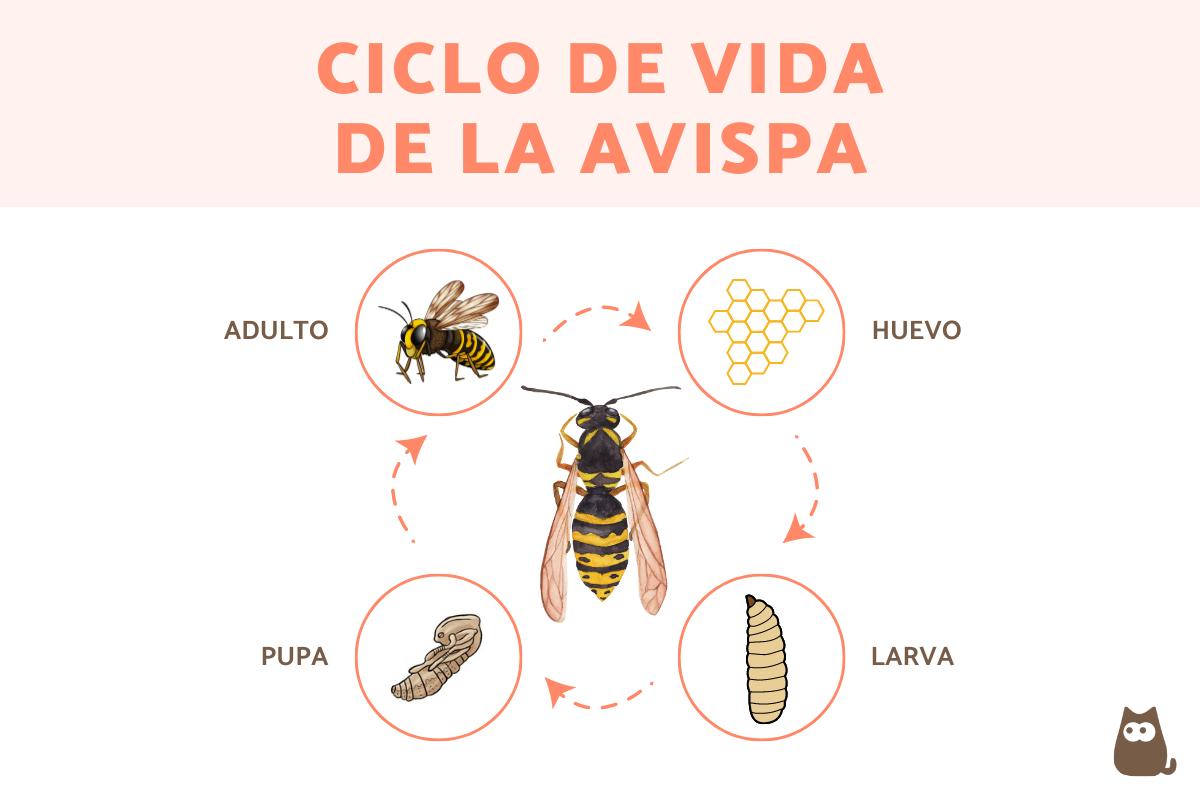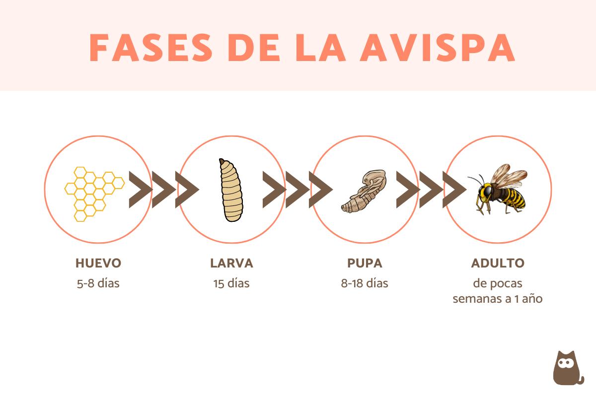 En general, las avisas tienen un ciclo de vida compuesto por varias fases: huevo, larva, pupa y adulto. Pueden existir particularidades según la especie y las condiciones ambientales, pero en general el tiempo que dura el ciclo de vida de las avispas es más o menos así: