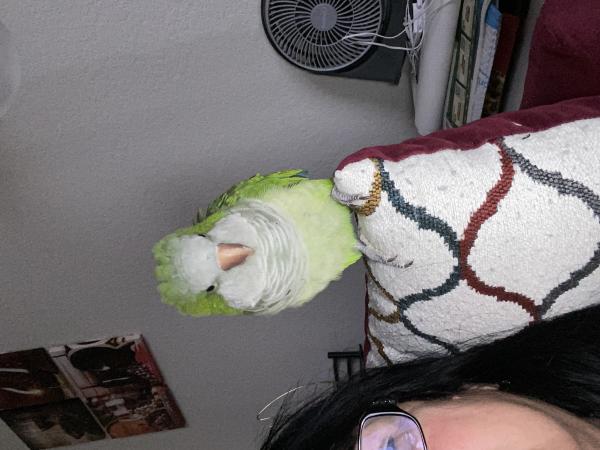 Hoy tuve una visita no deseada de un exnovio y el trató de acercarse a mi y yo me negué y mi Cotorrita voló y le cayó arriba a Picotazo , es usual en estas Cotys o es la mía solamente , ella lleva 2 años conmigo, sólo ella y yo y casi siempre está así cerca de mí, tenemos una relación muy linda