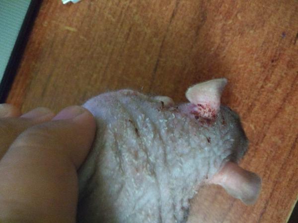 Adopte a una rata egipcia hace 1 mes aprox, tiene alrededor de 6 meses según me comentaron, fue rescatada de un laboratorio, según me comentaron a el no le hicieron nada, desde hace 3 semanas aprox se le empezó como a descarapelar la piel y se rasca al punto de sangrar, que podrá ser?, de momento lo tengo a el solo pero juego mucho con el.
