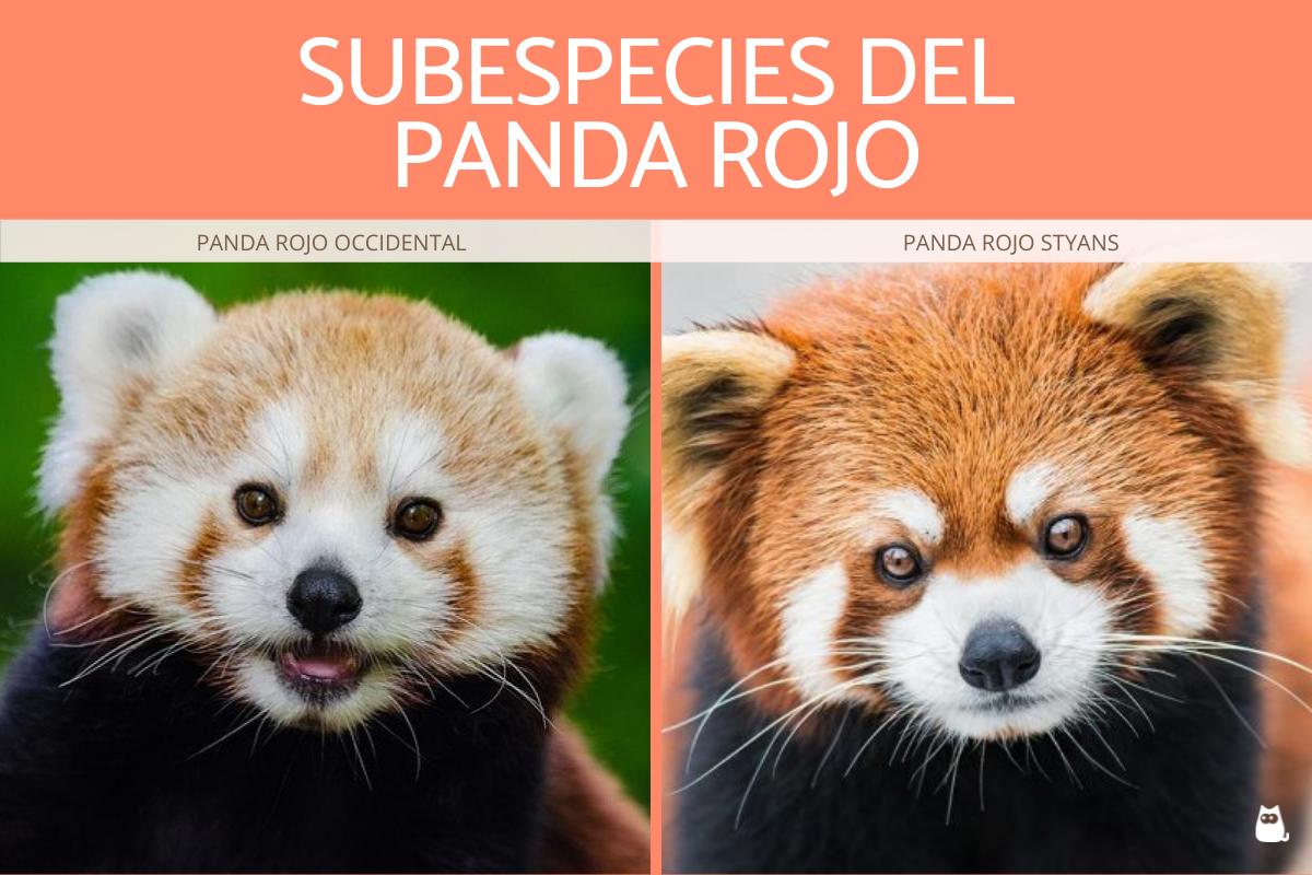 Existen dos subespecies de panda menor: el panda rojo occidental (Ailurus fulgens fulgens) y el panda rojo styans (Ailurus fulgens styani). El panda rojo occidental presenta una máscara menos marcada en la cara y es de un tamaño un poco inferior. A diferencias de sus parientes los mapaches, los pandas rojos poseen el pelaje de la zona del abdomen más oscuro que el del resto del cuerpo.