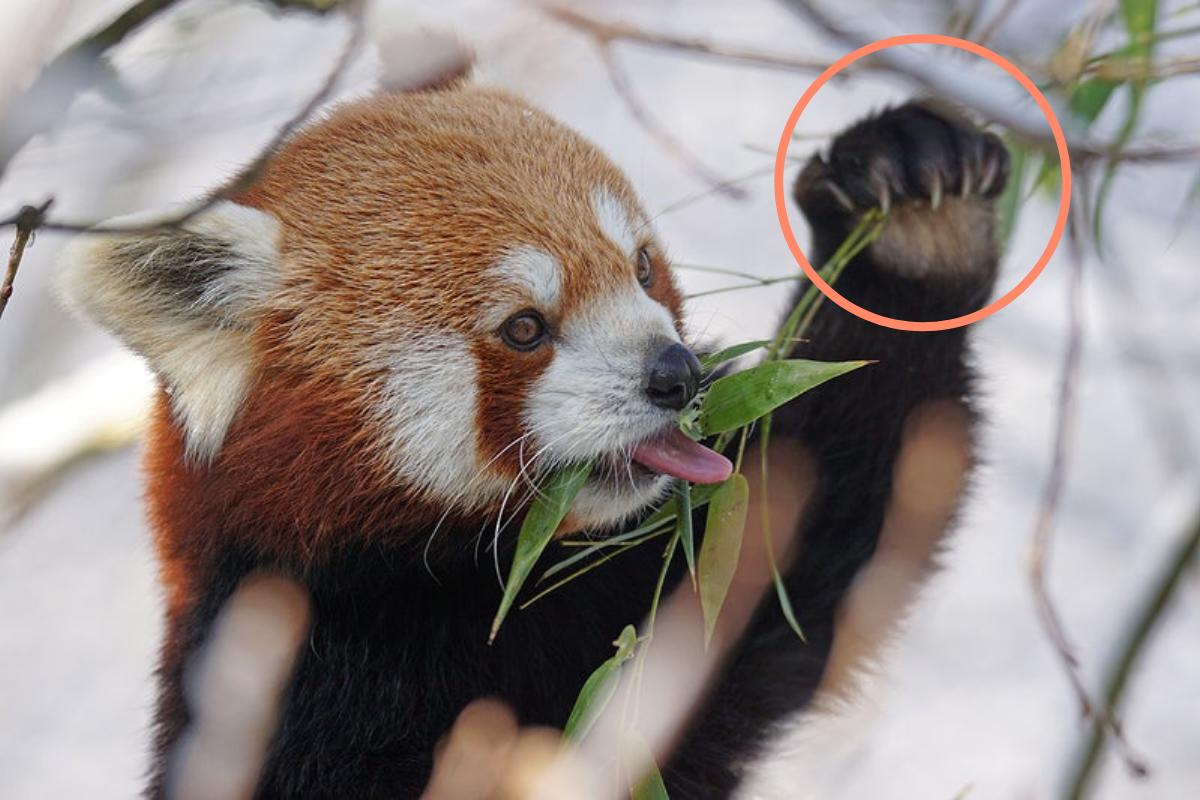 Los pandas rojos no poseen pulgares oponibles propiamente dichos, pero sí tienen un hueso largo en la muñeca que les facilita la tarea de agarrarse a las ramas y de llevarse los alimentos a la boca, al igual que sucede con el panda gigante. El panda rojo posee garras semirretráctiles que recuerdan a las de los felinos.