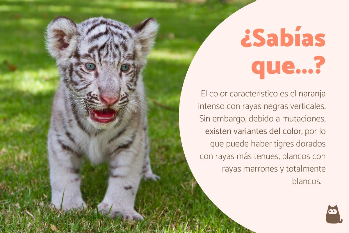 El pelaje de los tigres es sin duda hermoso y muestra una combinación de colores muy llamativa. El color característico es el naranja intenso con rayas negras verticales que varían de grosor, además, en la cara y desde el cuello hasta la zona ventral hay presencia del color blanco. Sin embargo, debido a mutaciones, existen variantes del color, por lo que puede haber tigres dorados con rayas más tenues, blancos con rayas marrones y totalmente blancos. No obstante, en la naturaleza son ya casi inexistentes.