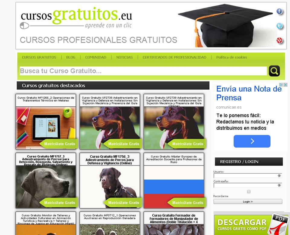 Cursos Gratuitos es página web que ofrece cursos de formación Online de prácticamente cualquier ámbito. Disponen cursos para trabajadores, cursos para autónomos, cursos para desempleados, cursos gratuitos Online y cursos de la junta de Andalucía. Los cursos son 100% bonificables para trabajadores contratados del régimen general y están parcialmente subvencionados para estudiantes, desempleados, autónomos y funcionarios. Disponen de una amplia variedad de cursos Online gratuitos relacionados con el mundo animal en los que los usuarios se pueden matricular.