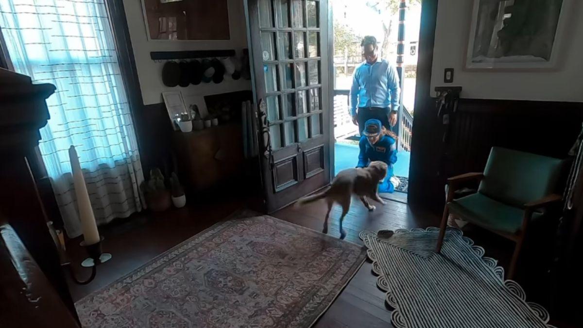 Cuando la puerta se abre, Sadie se lanza al instante sobre su tutora y, acto seguido, corre a buscar su peluche para llevárselo y animarla a jugar con ella, un gesto que refleja su excitación y ganas de pasar tiempo juntas.