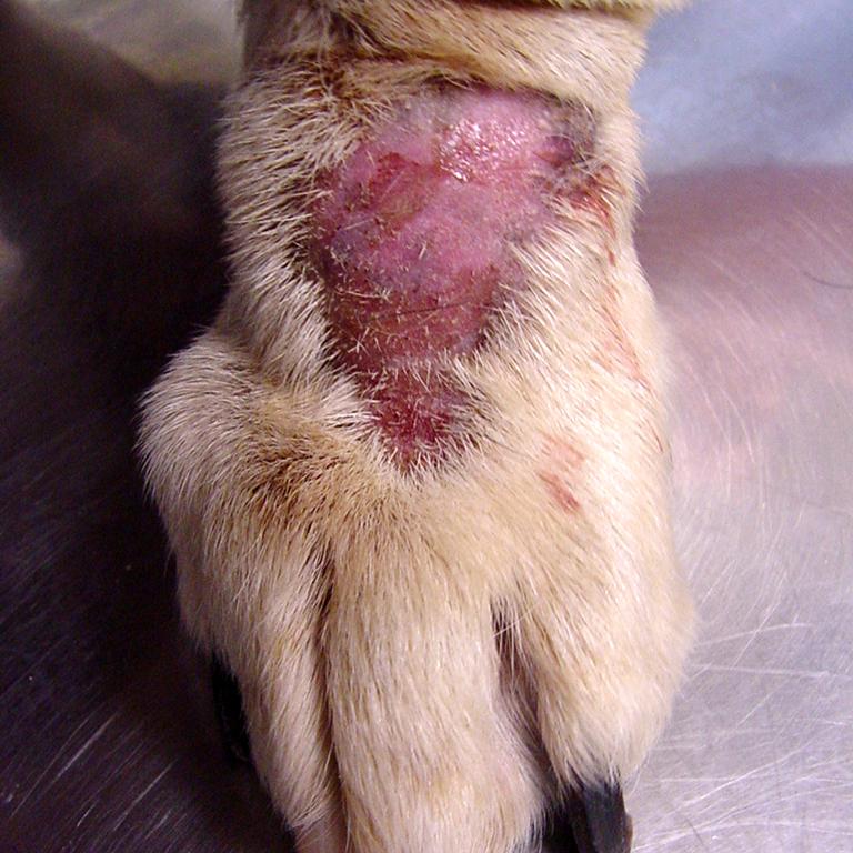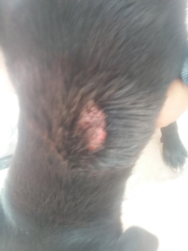 Hola este tipo de lesion le salio ayer, le puse una crema con antibiotico pero hoy triplico su tamaño. Aparte de lo que me recomiende el veterinario.