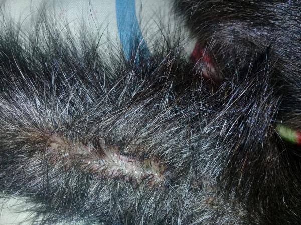 Hola! Que tal. Mi perrita dachshund hace ya dos meses que tiene una parte en el lomo que le falta pelo y no le crece más... tiene la piel seca en esa parte y como costritas rojas y como caspa. Me indicaron Tritohexidin Plus (solucion antiseptica y antiinflamatoria) y crema macril, le hago tratamiento de pulgas pero todavia nada... ella se rasca a veces, pero no se toca la herida, igualmente no le crece más el pelo!!!