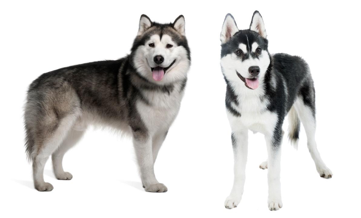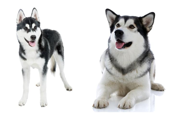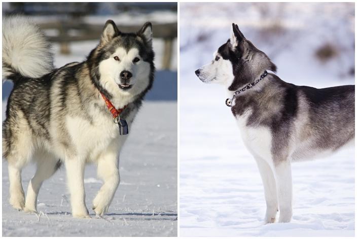 Para empezar podemos observar una diferencia de peso y tamaño entre ambos ejemplares. El husky es notoriamente más fino y ligero, algo más pequeño, mientras que el malamute de alaksa es algo más robusto y grande: