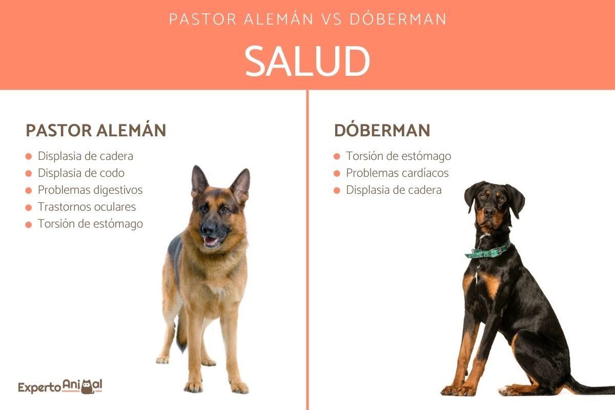 Así, en el dóberman son más habituales las patologías que afectan al corazón. En cambio, el pastor alemán, debido a su cría indiscriminada, padece trastornos oculares y gastrointestinales, entre otros. Además, esta cría descontrolada también ha provocado problemas de conducta en algunos ejemplares, como nerviosismo, miedo excesivo, timidez o agresividad (siempre que no haya sido correctamente educado ni socializado). En el dóberman también puede detectarse un carácter excesivamente nervioso.