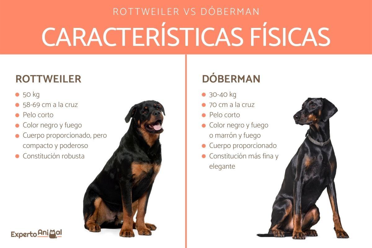 El dóberman es un animal muy inteligente y con gran capacidad para el aprendizaje. En cuanto a su aspecto, es de talla grande y de complexión atlética, su peso oscila entre los 30-40 kg y la altura a la cruz se encuentra entre los 65-69 cm. A simple vista, es un perro mucho más fino y elegante que el rottweiler, siendo esta una de sus principales diferencias.