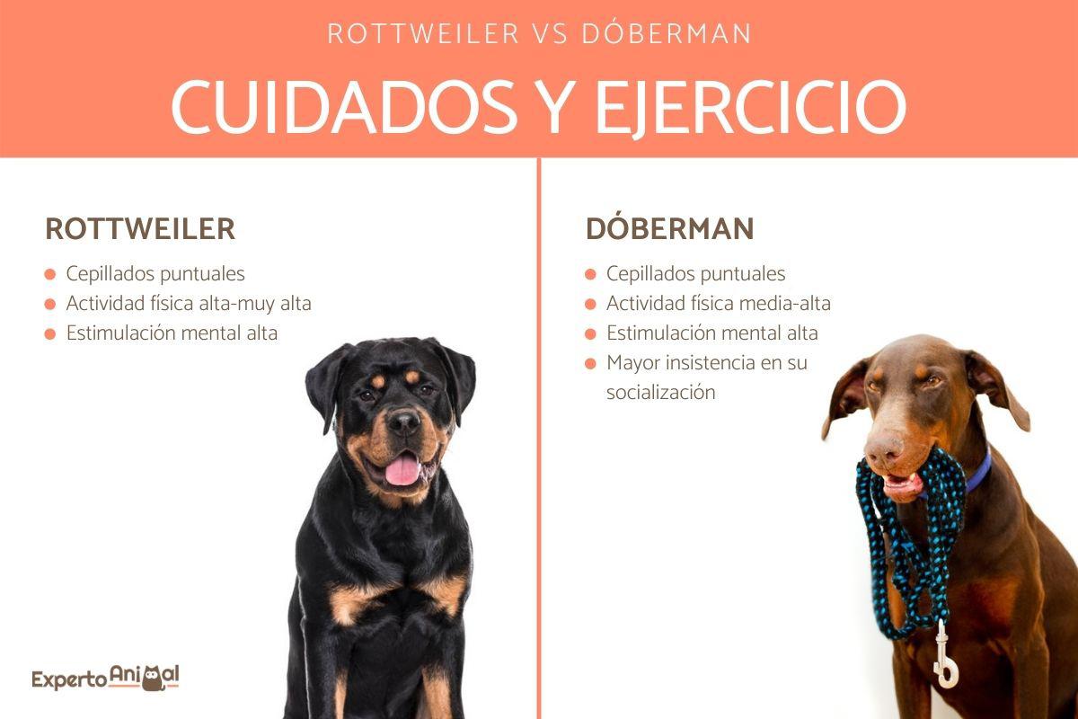 Tanto en el cuidado del manto como en la posibilidad de adaptarse a la vida en la ciudad, las relaciones en ocasiones problemáticas con otros perros y la necesidad de socialización y de educación no hay excesivas diferencias entre dóberman y rottweiler. Quizás el punto en el que sí difieren es el de la actividad física. Se considera, aunque parezca que su aspecto indica lo contrario, que el rottweiler requiere más ejercicio físico.