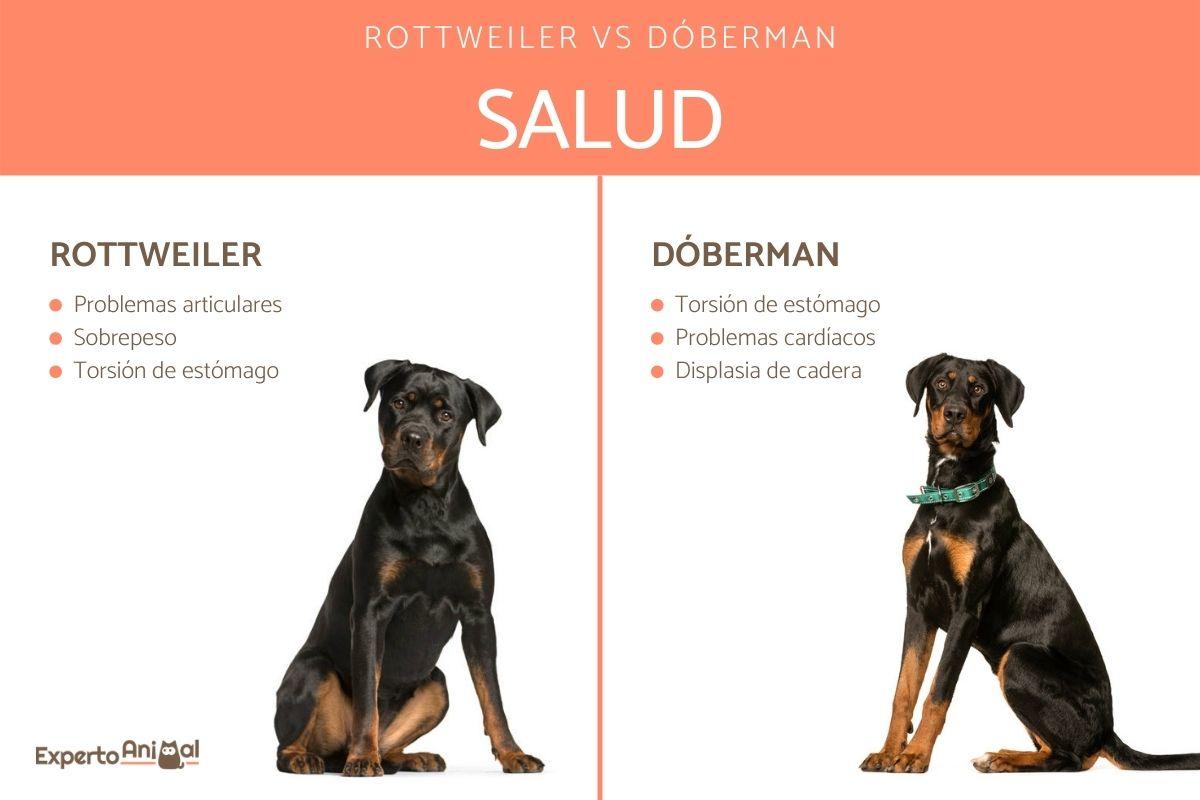 En general, al tratarse las dos de razas de perros de tamaño grande, van a compartir la propensión a sufrir algunos trastornos, como la torsión de estómago o los problemas en las articulaciones. Pero también hay diferencias entre dóberman y rottweiler en este aspecto. Así, el dóberman tiene tendencia a padecer problemas de corazón. En el rottweiler en cambio destaca su tendencia al sobrepeso. De ahí la necesidad de ejercitarlo lo suficiente o de no excederse con la comida.