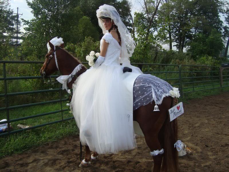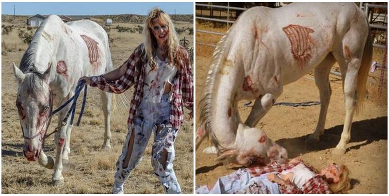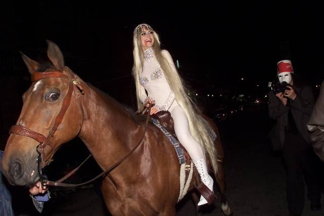 El siguiente de los disfraces para caballos y jinetes tiene su origen en Heidi Klum. No sabemos del todo si consigue dar ese "miedo" tan común de Halloween ya que para algunos puede ser incluso gracioso (o una mezcla de los dos). A nosotros nos inquieta. Para lograr el efecto de "disfraz sin identificar" necesitarás: captar al caballo en un momento poco favorecedor, un look hippie/sangriento con lentejuelas. Este disfraz para caballos es de los mejores, ya que no tendrás que ponerle nada a él y no le molestarás.